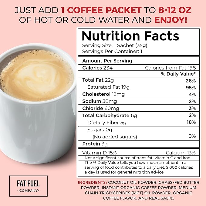 FAT FUEL Keto Coffee 22g Premium Fats – With Grass Fed Butter, MCT Oil, Coconut & Redmond Real Salt – Instant Organic Coffee, One Net Carb, A True Meal Replacement – 15 Servings